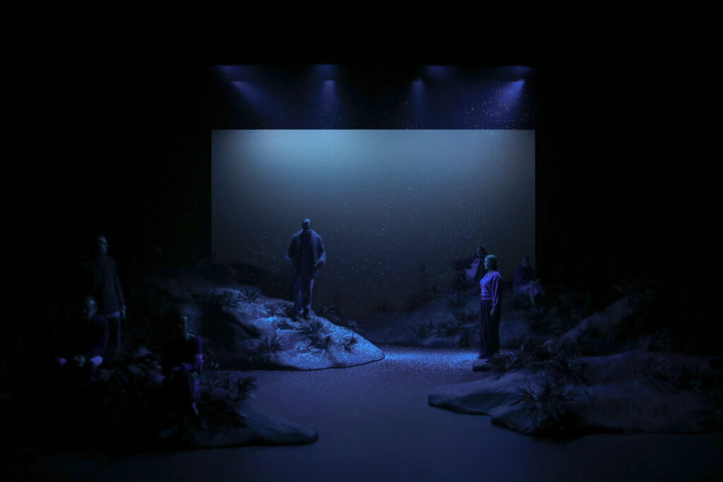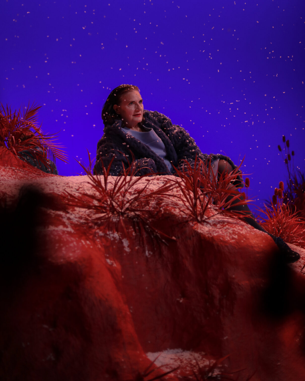 Inspirationen til scenografien kommer bl.a. fra infrarød fotografi af naturen, hvor farvegengivelsen er anderledes end det, menneskets øje opfanger. Sneen skal skabe en fredfyldt stemning og give en følelse af at være afskåret fra omverdenen – et sted, hvor man fokuserer på det eksistentielle og de nære relationer.